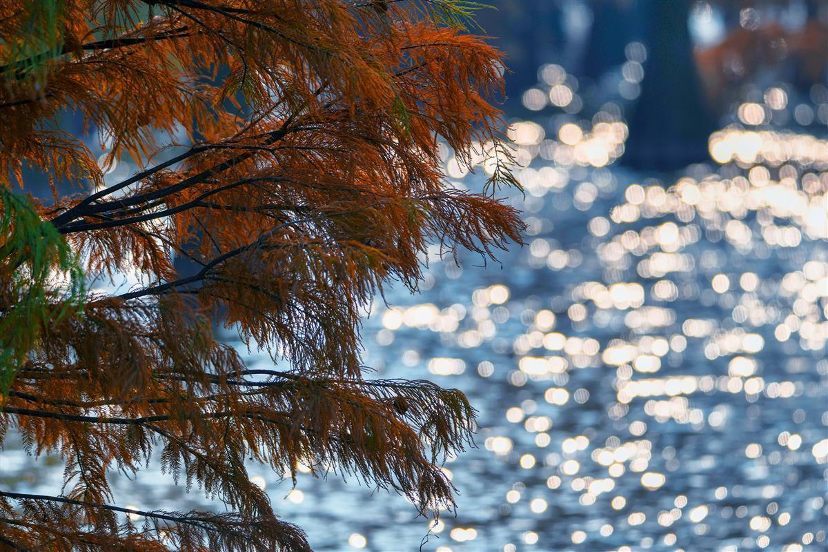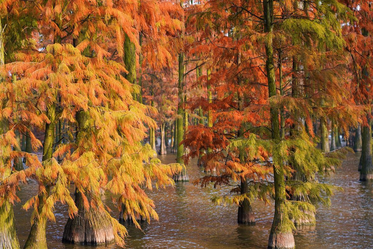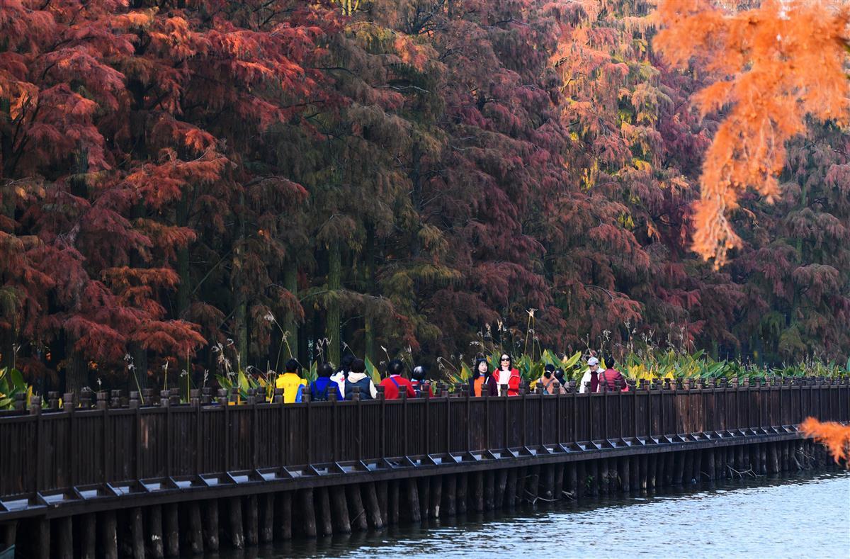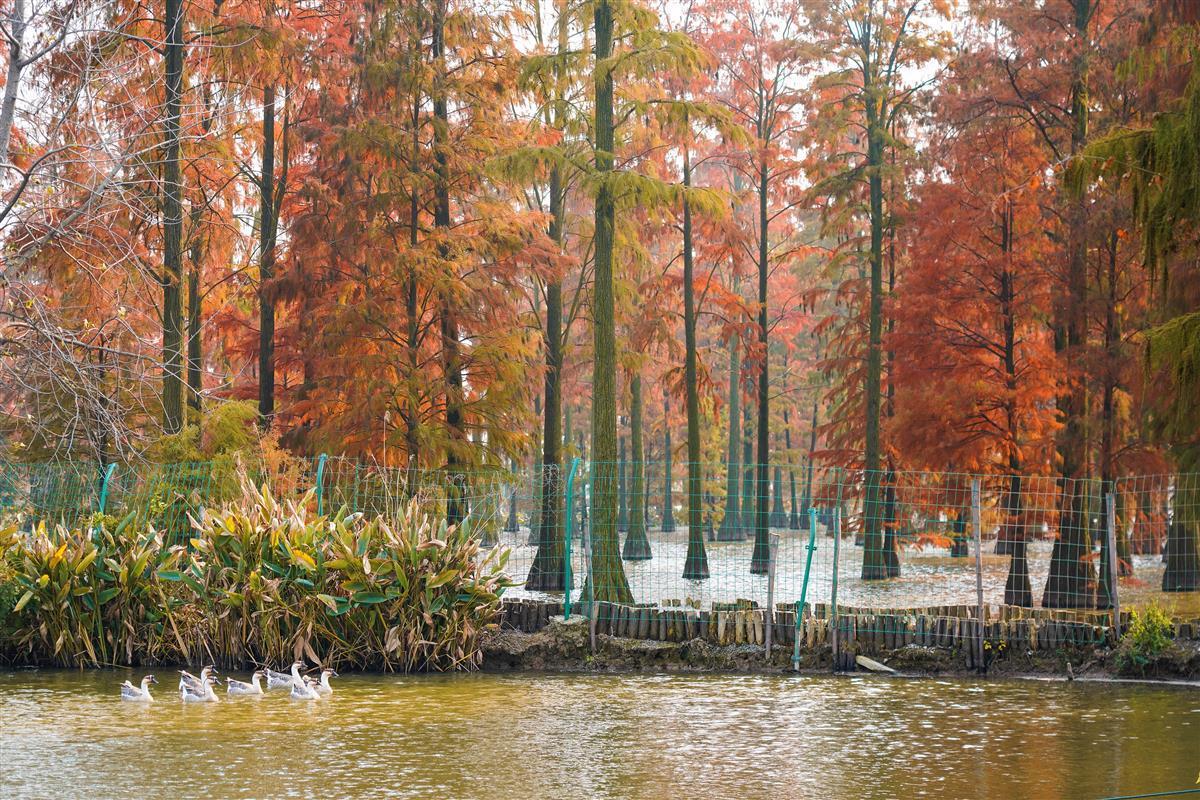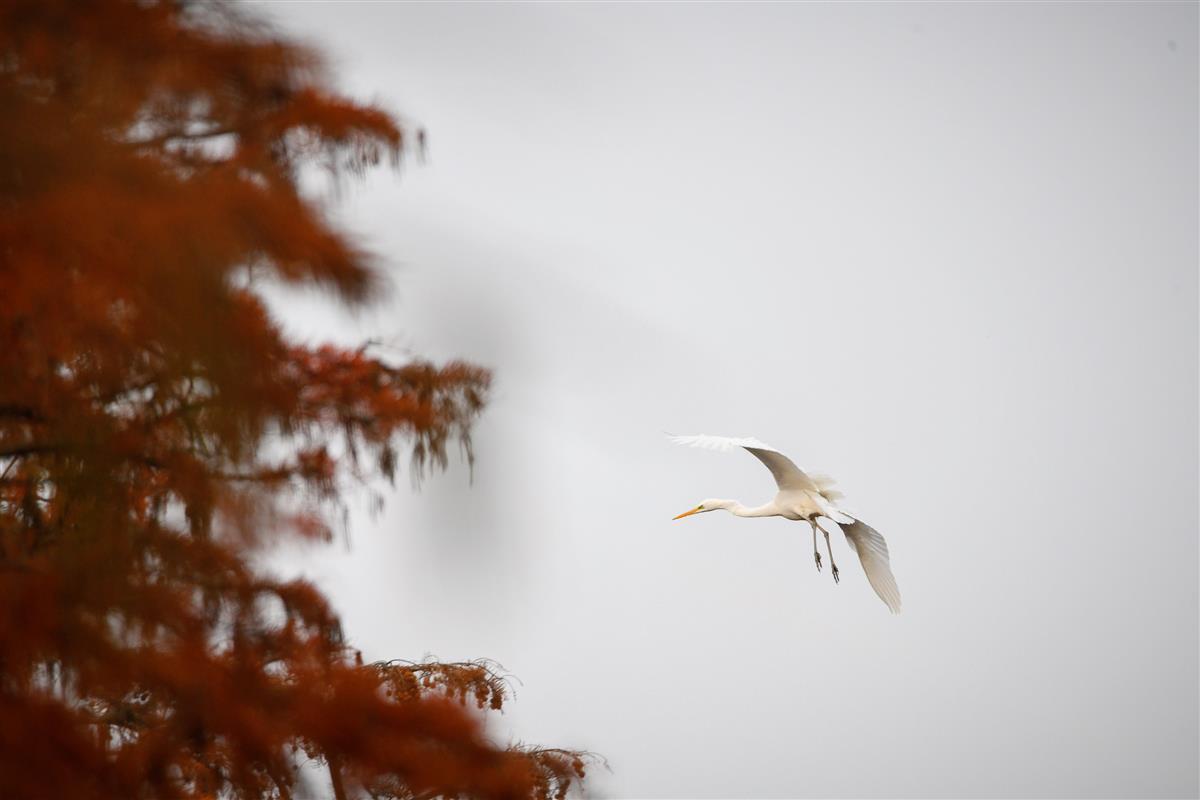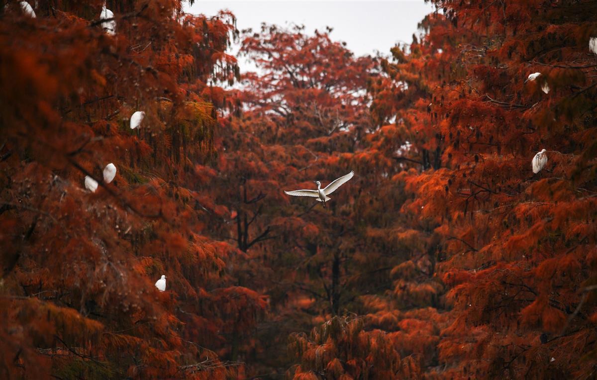 11月29日,漫步在涨渡湖湿地“水上森林”的栈道上,只见万棵水杉在水里成排成行,如一片“世外森林”。水杉红叶似火,静静伫立水中,树与水交相辉映,如诗似画。白鹭、苍鹭在水中信步闲游,或在树上休憩,或振翅高飞,远远望去,美不胜收。