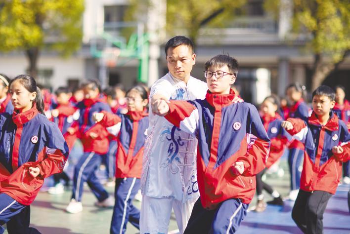 11月27日,黄梅县第一小学,非遗传承人雷超(前)指导学生操练岳家拳。