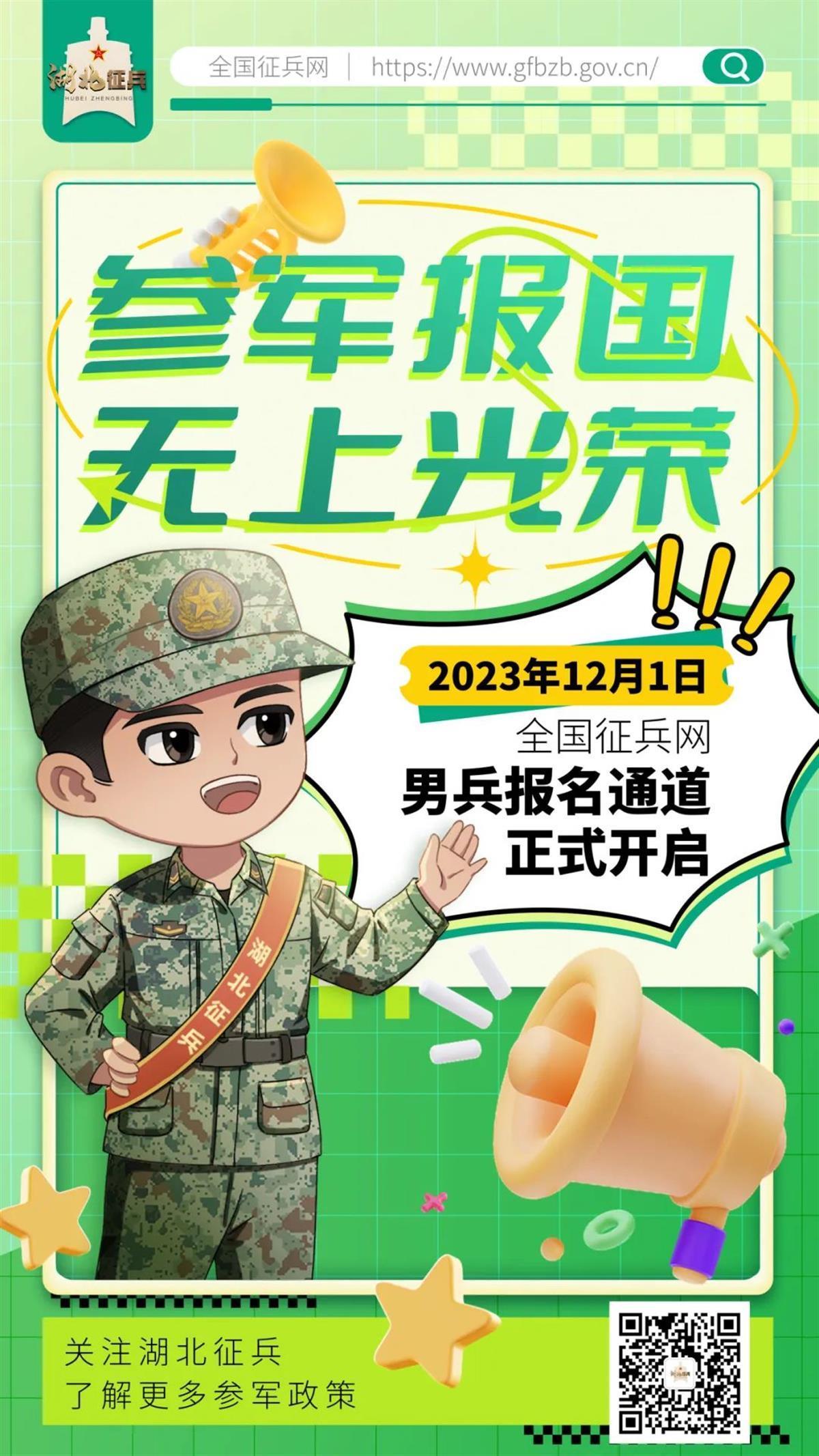 极目新闻记者12月1日从湖北省征兵办了解到,2023年12月1日,全国征兵网男兵报名通道正式开启,想参军的小伙伴速度集合!