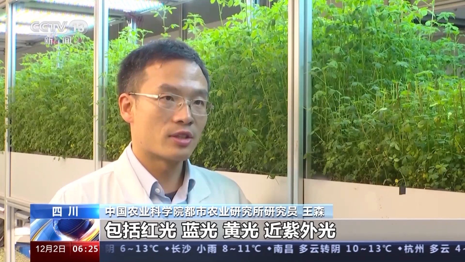 中国农业科学院都市农业研究所研究员 王森:包括红光、蓝光、黄光、近紫外光或者是近红外光,这些光对作物是有用的。我们现在用的LED灯,它称为固态的冷光源。它的光的颜色是可以精准配比的。