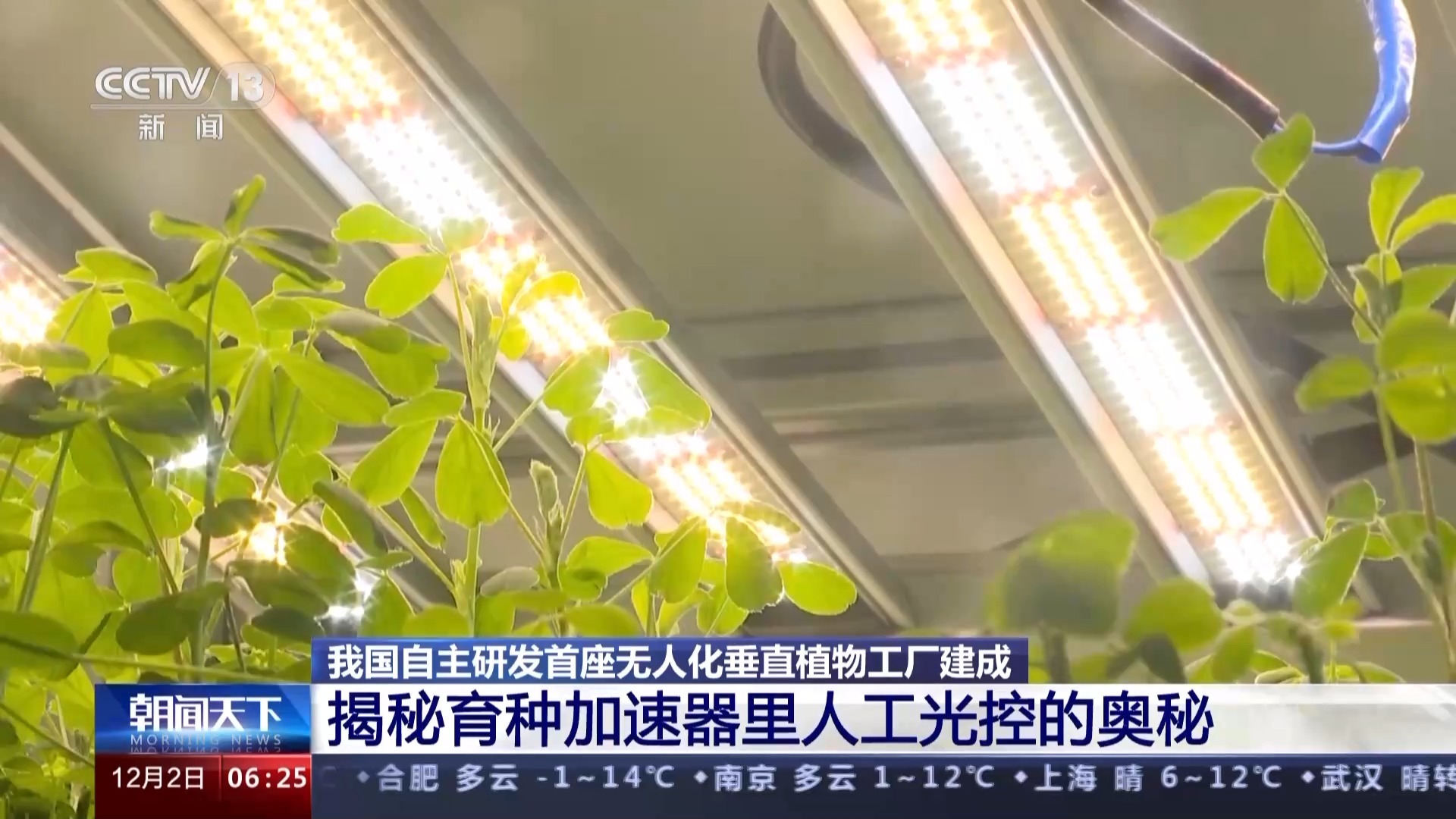 记者在垂直植物工厂里看到,作物上面密密麻麻布满了LED光源。专家告诉记者,这些人工光源,模拟和替代了自然光。而加快作物发育和育种过程,就是通过精准控制光的亮度和颜色来实现的。