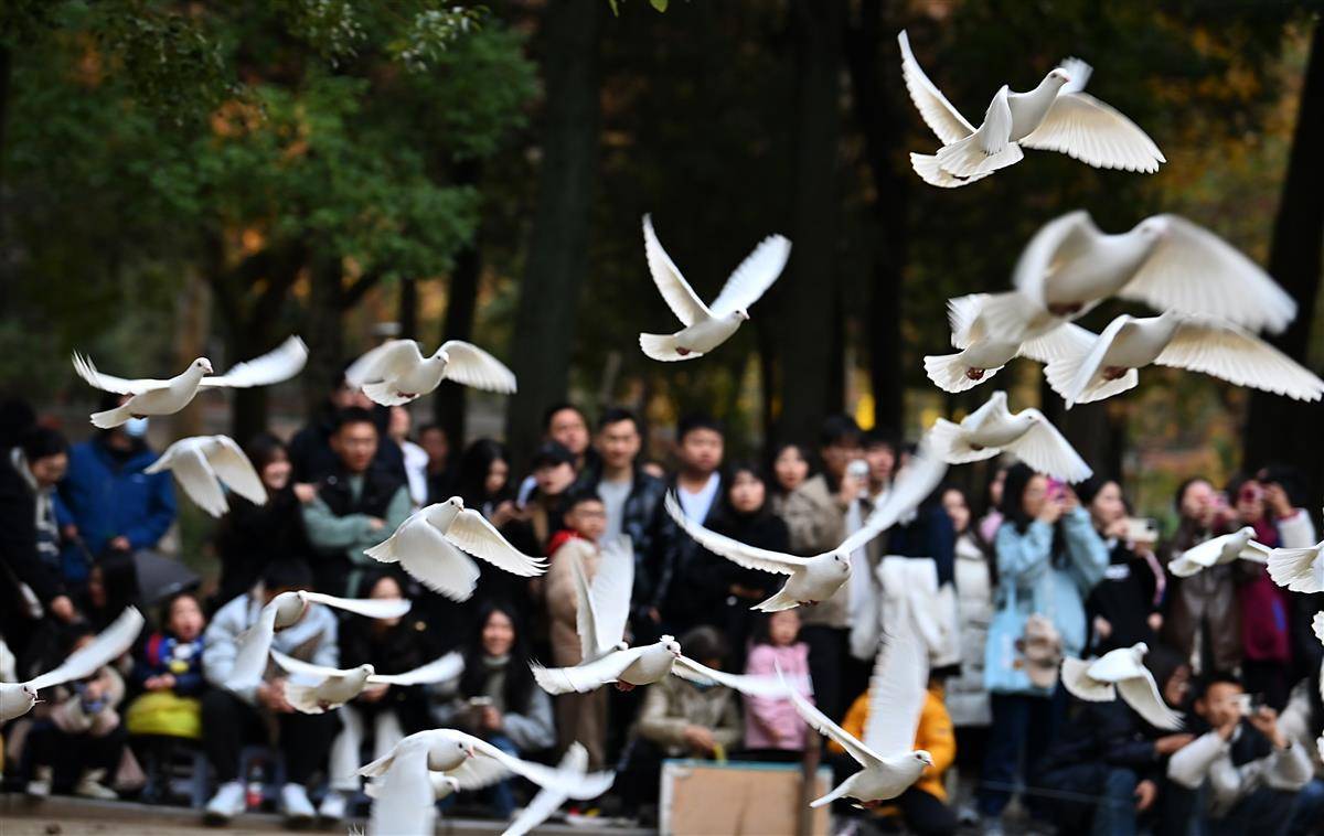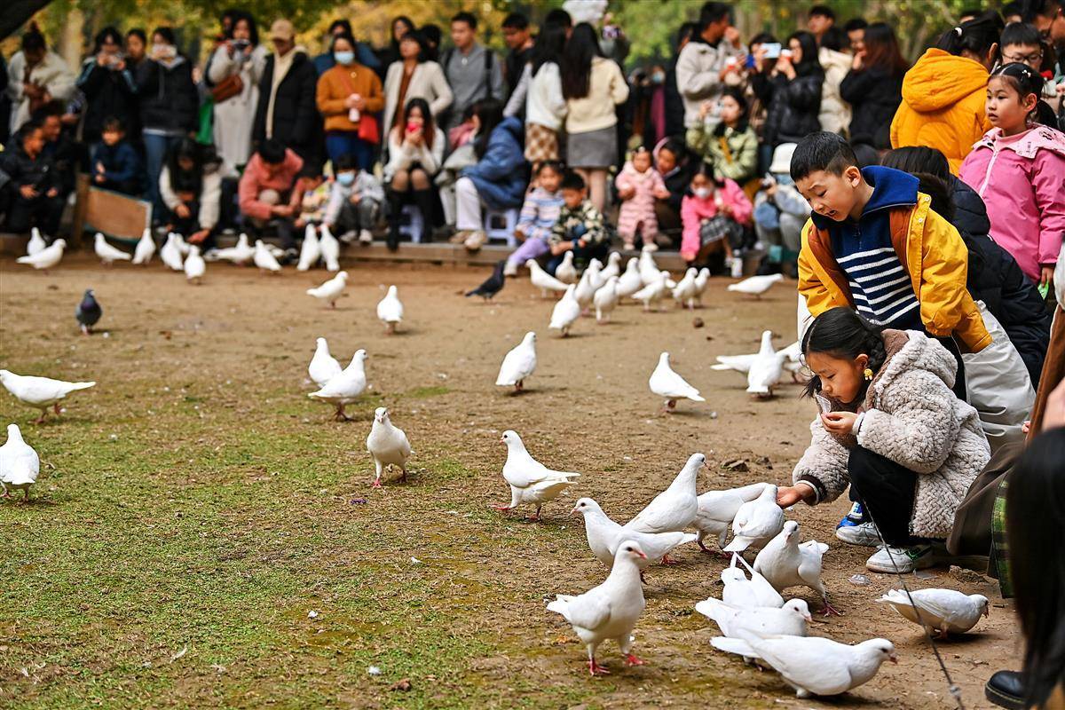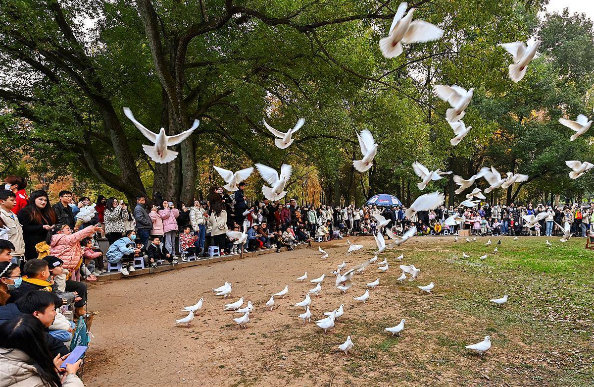 12月2日,武汉阳光明媚,空气清新,许多市民利用周末纷纷走出家门来到户外悠闲游玩,在解放公园出现千人观赏和投喂鸽子景象,鸽子与人非常亲近,它们会飞到人们手上、身上,与人和谐相处。
