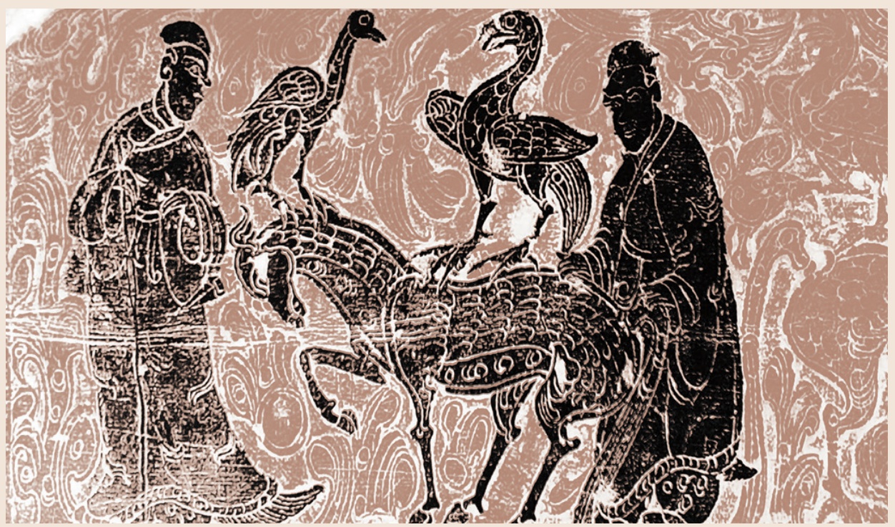 △ 汉魏《皋陶治狱图》画像石。画像石中的獬豸(xiè zhì)正用刺顶触一人,它身后为被尊为狱神的皋陶(gāo yáo)。