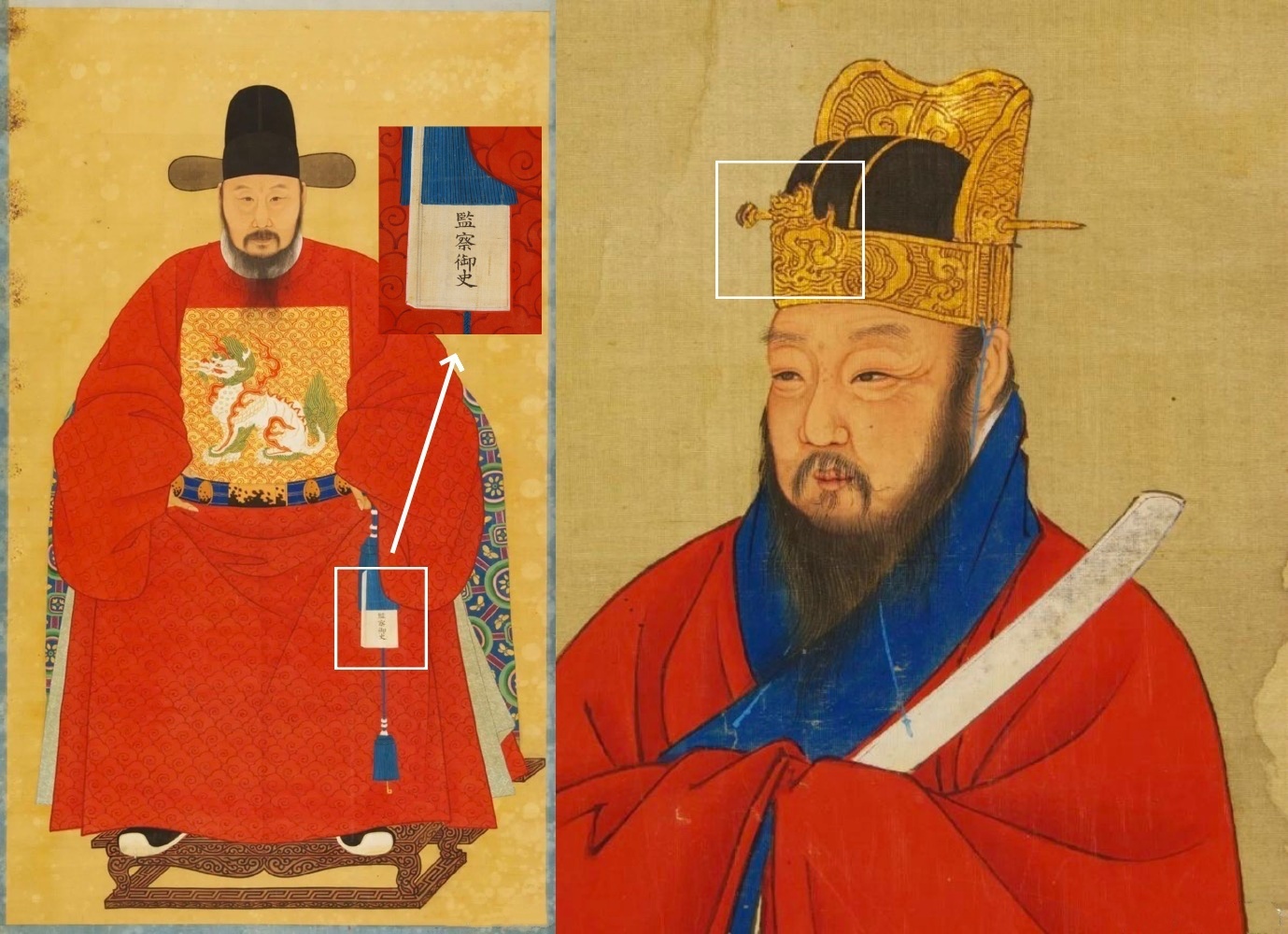 △ 蓝田常服像(左)与蓝田朝服像(局部),烟台市博物馆藏。蓝田(1477~1555),山东即墨人,嘉靖年间进士,授河南道监察御史。常服是办理公务时所穿,戴乌纱帽、穿带有补子的袍服是其特征。作为监察御史,蓝田的常服补子图案为獬豸(xiè zhì)。朝服是官员在重大典礼时所穿的礼服,身为监察御史,蓝田所戴的正是獬豸(xiè zhì)冠。
