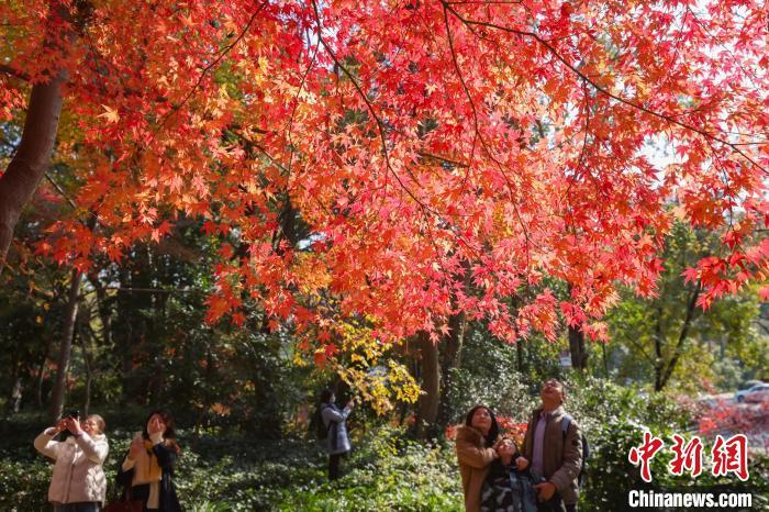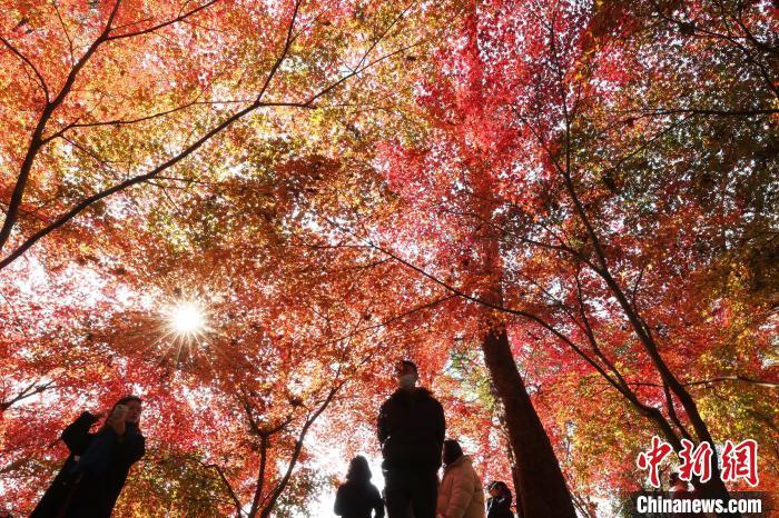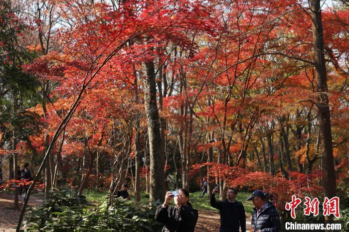 12月3日,南京紫金山红枫岗枝叶层叠,呈现多彩“枫”景“醉”游人。