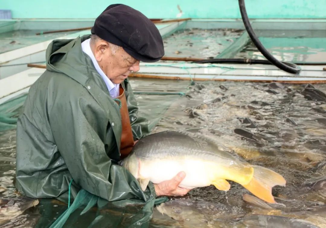 金万昆(中)抱起一条“种鱼”(资料照片)。新华社发