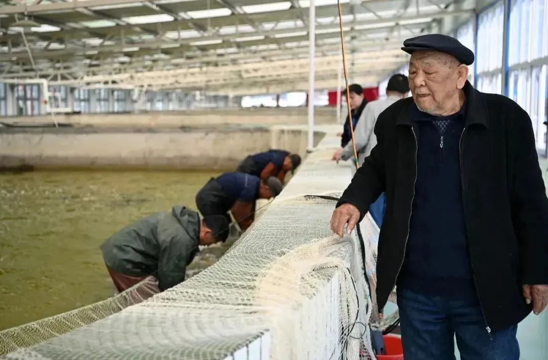 在天津市换新水产良种场,金万昆在鱼池边巡看(2022年4月15日摄)。