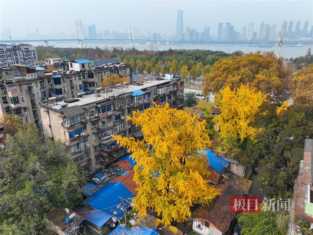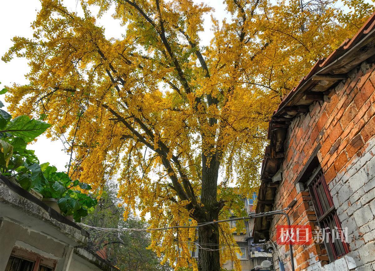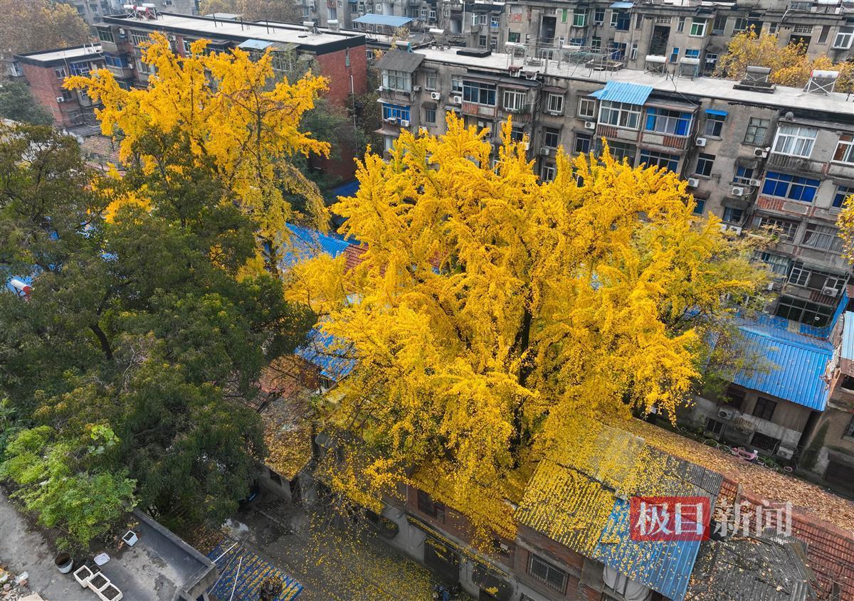在武汉市武昌区的粤汉里社区,两株古老的银杏树迎来了它们一年中的高光时刻:一片片挂满枝头的“小金扇”在阳光下熠熠生辉。微风拂过,银杏叶随风飘落在地面上,铺就金色“地毯”。