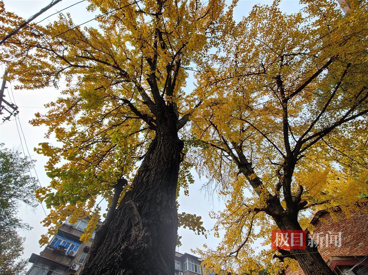 记者在现场看到,这两株银杏树树龄分别为133年和123年,树高近20米,社区及园林部门在树下增设了保护围栏和座椅,供居民休憩。