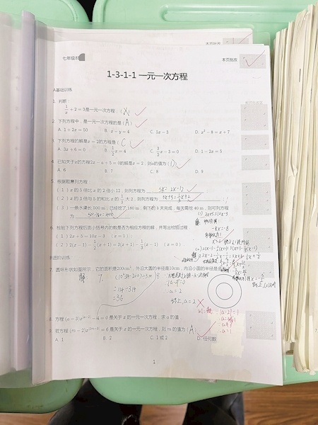凝聚了数学组教师智慧的题库如何应用?首先,学生将和教材大小和厚度相近的题库进行打印,用档案夹的形式保存,在题库上做练习题。学生完成作业后,老师用带蓝牙功能的水性笔进行批阅,并把批阅的数据同步上传到数据库。作业报告生成后,会以弹窗的形式推送到教师手机上,教师若想了解到更加详细的数据,可到电脑端查看。