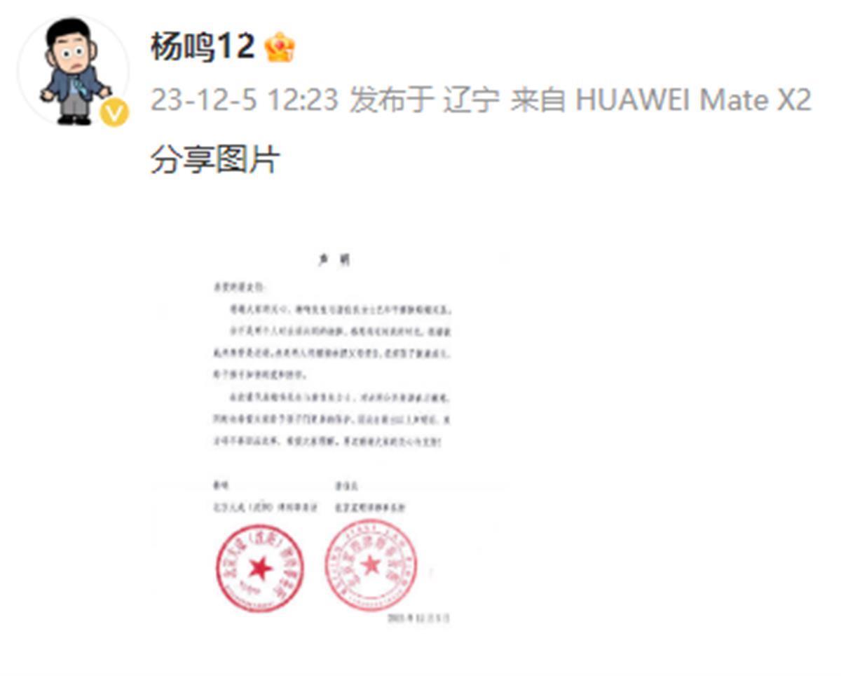 12月5日12时23分,有最帅教练之称的前篮球运动员杨鸣,在个人社交平台上正式宣布离婚。早于他一分钟,他的妻子唐佳良也在个人官方平台上发布了一模一样的离婚声明。