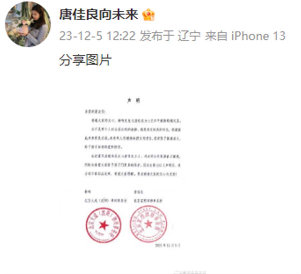 这份声明写得很平静,很理性:“感谢大家的关心,杨鸣先生与唐佳良女士已和平解除婚姻关系。分开是两个人对生活共同的抉择,感恩有过的美好时光,祝福彼此未来皆是坦途。未来两人将继续承担父母责任,抚育孩子健康成长给予孩子加倍的爱和陪伴。在此谨代表杨鸣先生与唐佳良女士,对占用公共资源表示歉意,同时也希望大家给予孩子们更多的保护。因此在做出以上声明后,双方将不再回应此事,希望大家理解。再次感谢大家的关心与支持!”