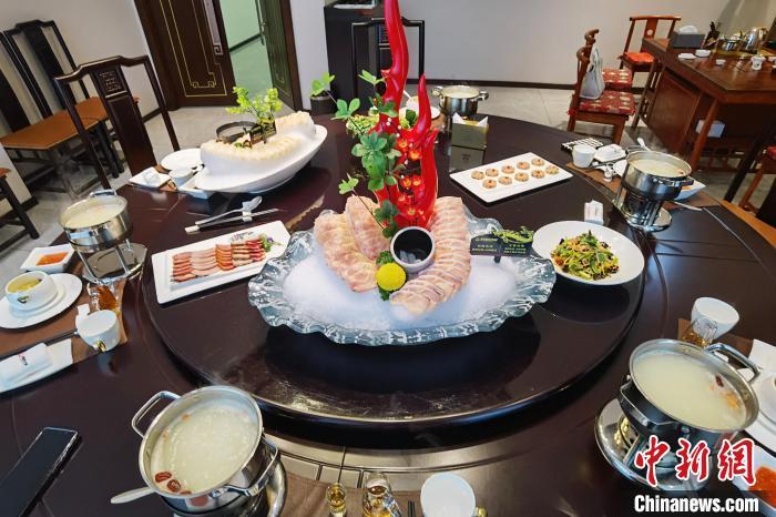 新鲜、丰富的鲟鳇全鱼火锅涮品。 中新社记者 王琳 摄