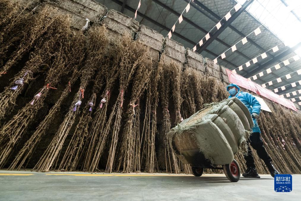 12月7日,在蕲春县的艾草仓储基地,工人在搬运陈艾。