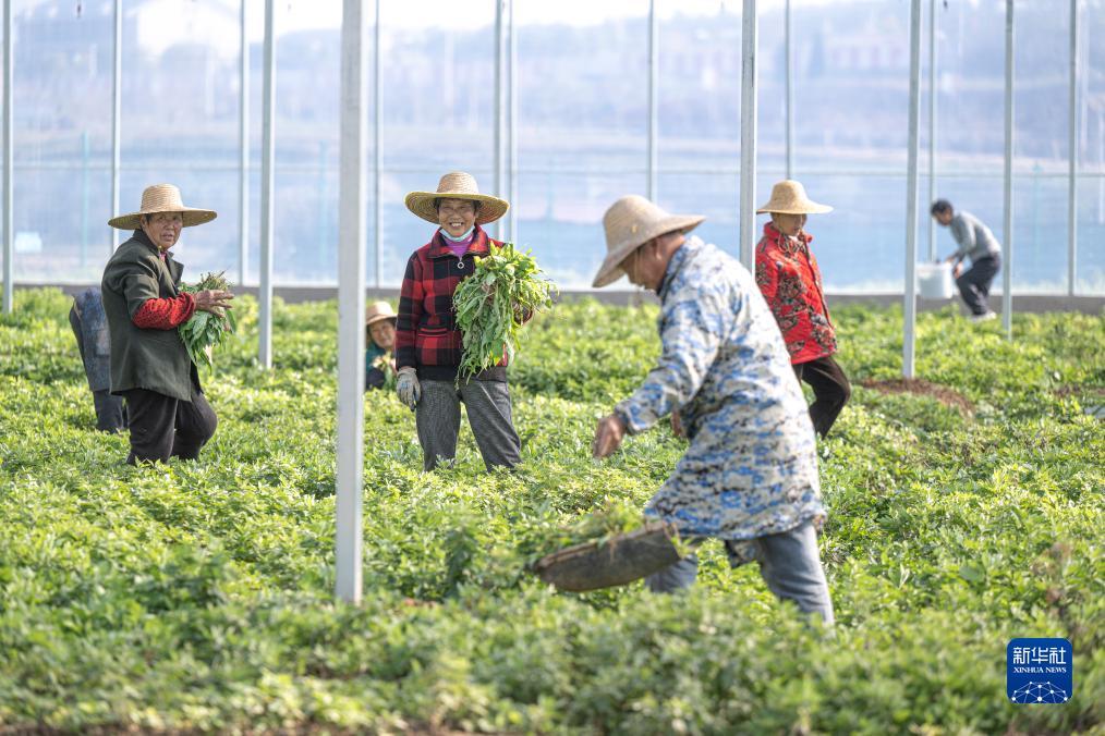 12月7日,在蕲春县蕲艾种苗培育基地,艾农在蕲艾地里进行管理作业。