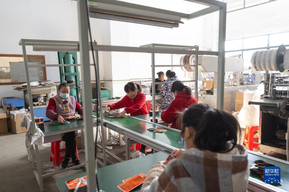 12月7日,在蕲春县石马山村的就业帮扶车间,工人在流水线上加工蕲艾产品。