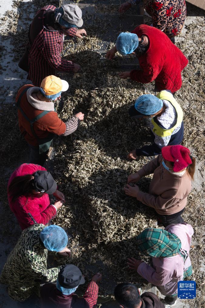 12月7日,在蕲春县高新铺村的就业帮扶车间,工人在对蕲艾进行初加工。