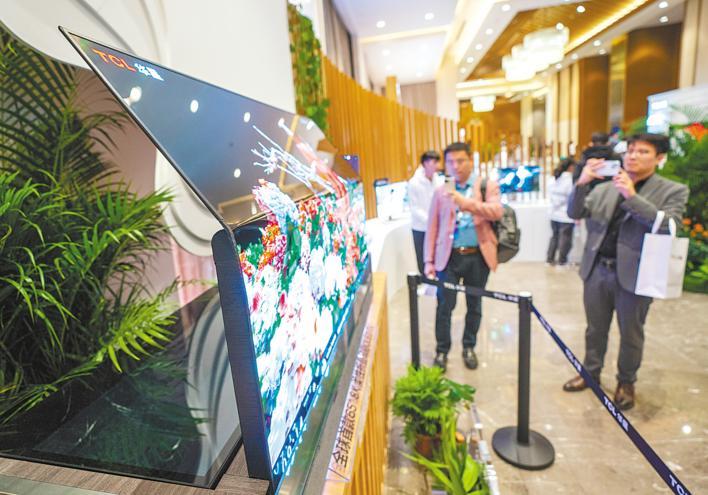 图为2023TCL华星全球显示生态大会现场,嘉宾们参观全球首款65英寸8K柔性折叠印刷OLED显示屏。12月7日,TCL华星发布四项全球首款显示产品,其中多项为“武汉造”。