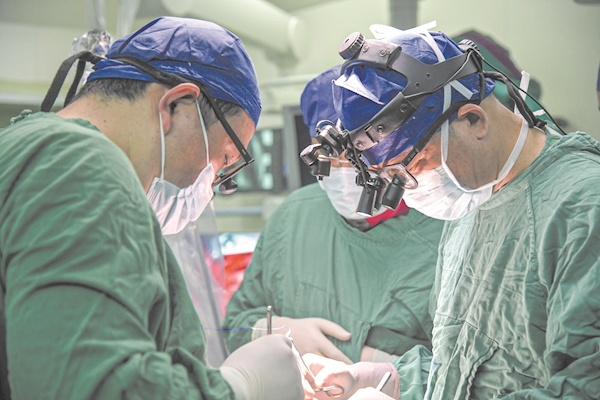董念国教授(右)带领团队手术中 通讯员陈有为摄