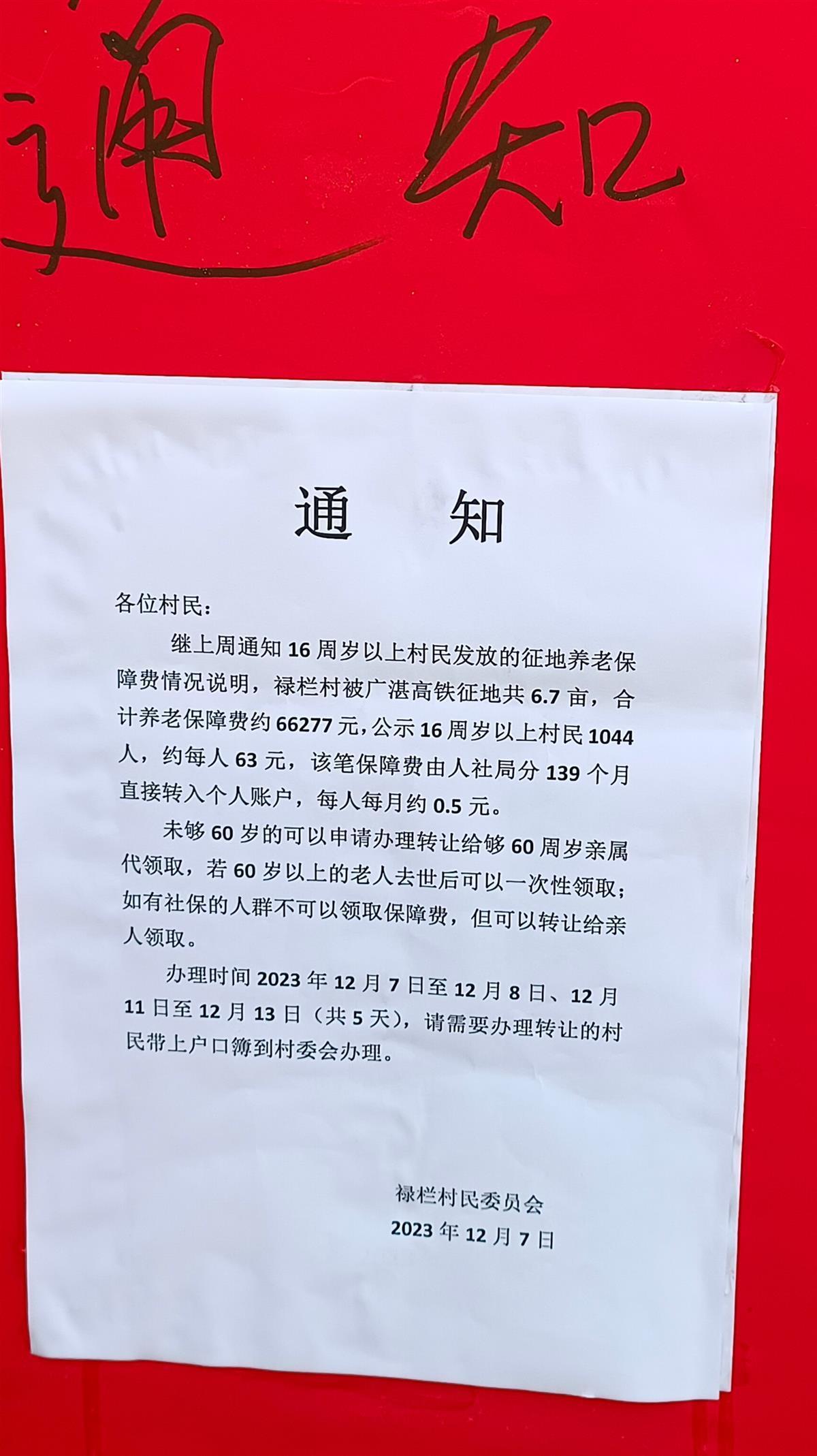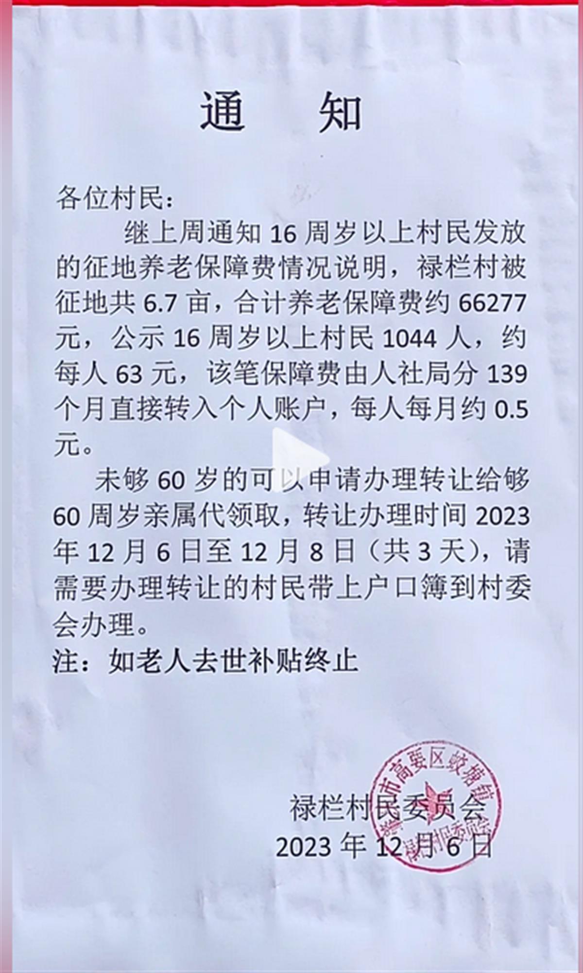 12月6日,广东肇庆市高要区蛟塘镇禄栏村村民委员会发布的一则通知显示:各位村民,继上周通知16周岁以上村民发放的征地养老保障费情况说明,禄栏村被征地共6.7亩,合计养老保障费约66277元,公示16周岁以上村民1044人,约每人63元,该笔保障费由人社局分139个月直接转入个人账户,每人每月约0.5元。