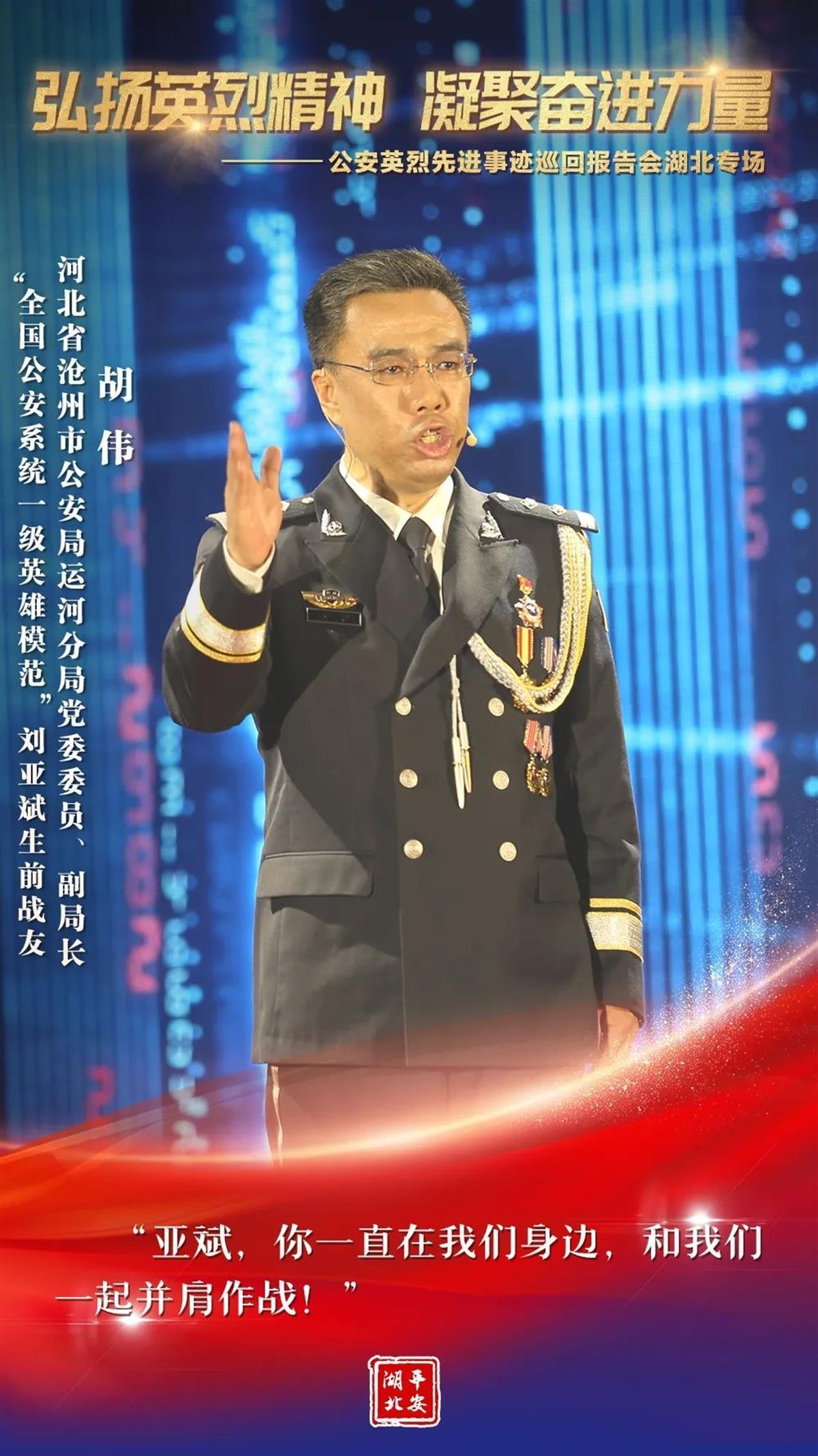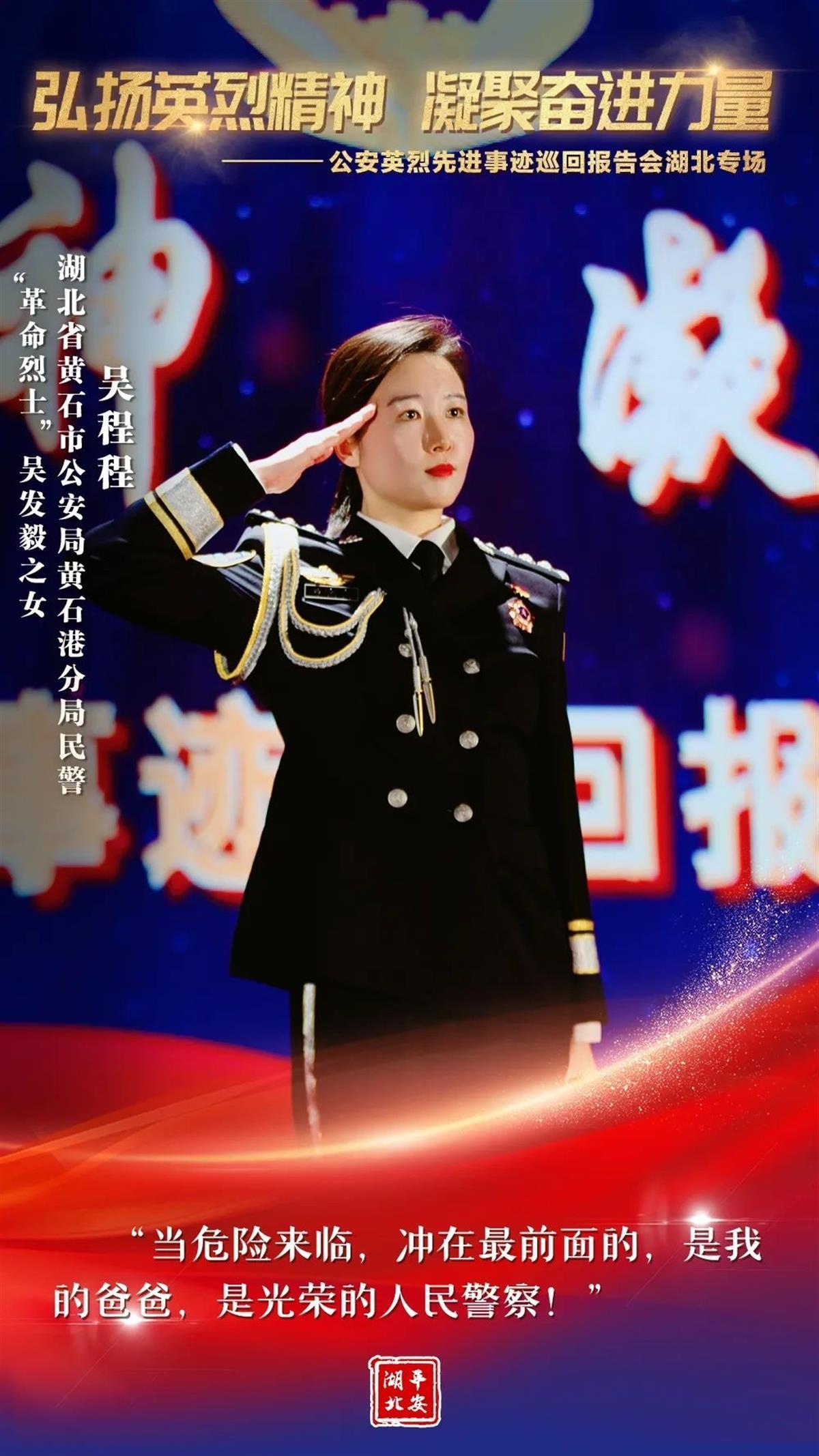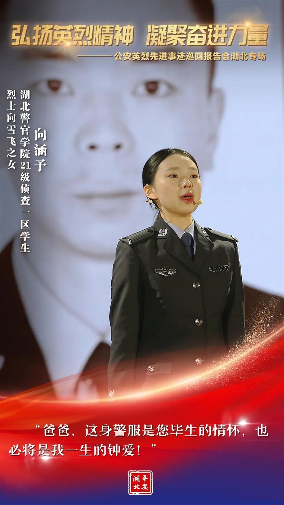 12月8日,全国公安英烈先进事迹报告团走进湖北,全省广大公安民警辅警聆听了报告。一个个公安英烈的故事感人肺腑、催人泪下,他们用责任、勇气、智慧和忠诚诠释了生命的无畏与精彩。他们的名字在警徽中闪光,他们的光荣在警旗上飞扬!