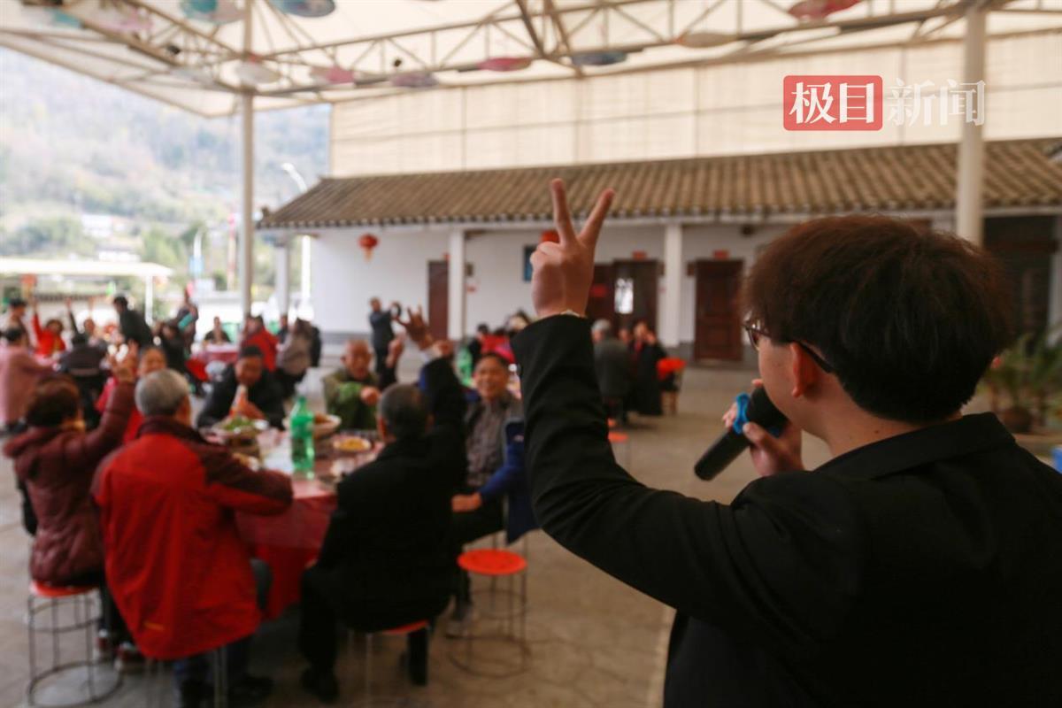 游客在湖北省宜昌市秭归县九畹溪镇石柱村品尝年猪宴