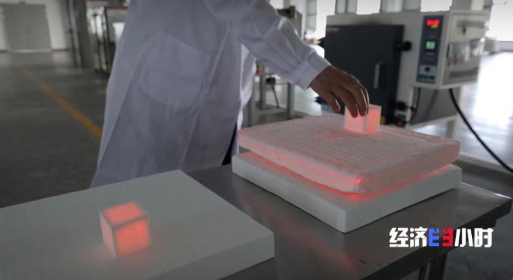在另一间厂房内,科研人员用两根手指捏住被加热到1000摄氏度的陶瓷块来回进行搬运,其秘密就在于这块陶瓷制品是防隔热陶瓷,也叫隔热瓦。陶瓷块从烤箱拿出来之后,虽然内部温度依然很高,但外表会迅速降为室内温度。