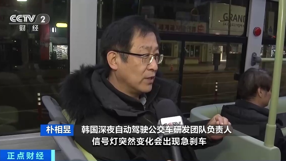 韩国深夜自动驾驶公交车研发团队负责人 朴相昱:信号灯突然变化会出现急刹车,系统偶然的错误识别也有可能导致紧急停车。尽管今天上路时没有出现类似情况,但以后可能会发生,今后我们会不断研究升级系统,特别是在认知领域需要做很大改善。