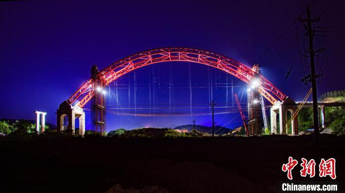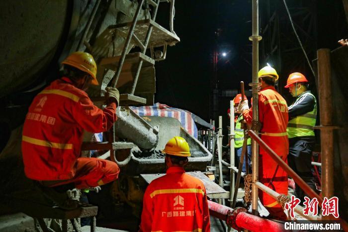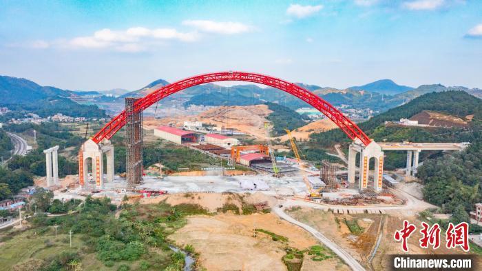 中新网钦州12月9日电(杨陈 罗雄鹰)12月8日晚,世界最大拱肋整体提升跨径和吨位的钢管混凝土拱桥——平陆运河旧州特大桥顺利完成最后一根拱肋主弦管管内混凝土灌注。至此,该桥8根拱肋主弦管全部完成管内混凝土灌注,大桥即将进入格子梁吊装施工阶段。