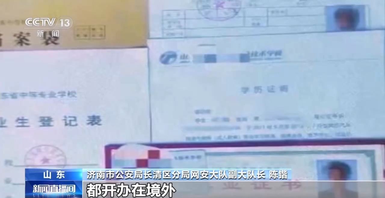 济南市公安局长清区分局网安大队副大队长 陈锴:我们发现这两个学校一个是与现在存在的学校名称比较接近,另外这两个学校开办的网站都开办在境外,这一点是非常反常的。所以我们将这些证件提供给咱们山东省的教育厅进行核实。经过核实,发现这两个证件确实是伪造的,而且上面的公章也是伪造的。