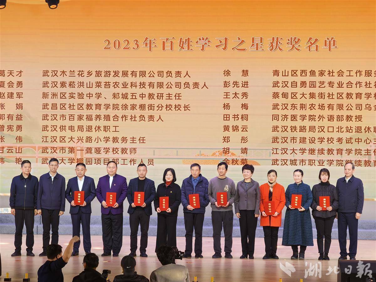 开幕式现场还为18位“武汉市百姓学习之星”、14个“武汉市终身学习品牌项目”授奖。全国百姓学习之星获得者、武汉木兰花乡旅游发展有限公司负责人葛天才表示,学习能改变命运、成就梦想,学习永无止境,他将带领公司员工努力学习,引领乡村振兴。