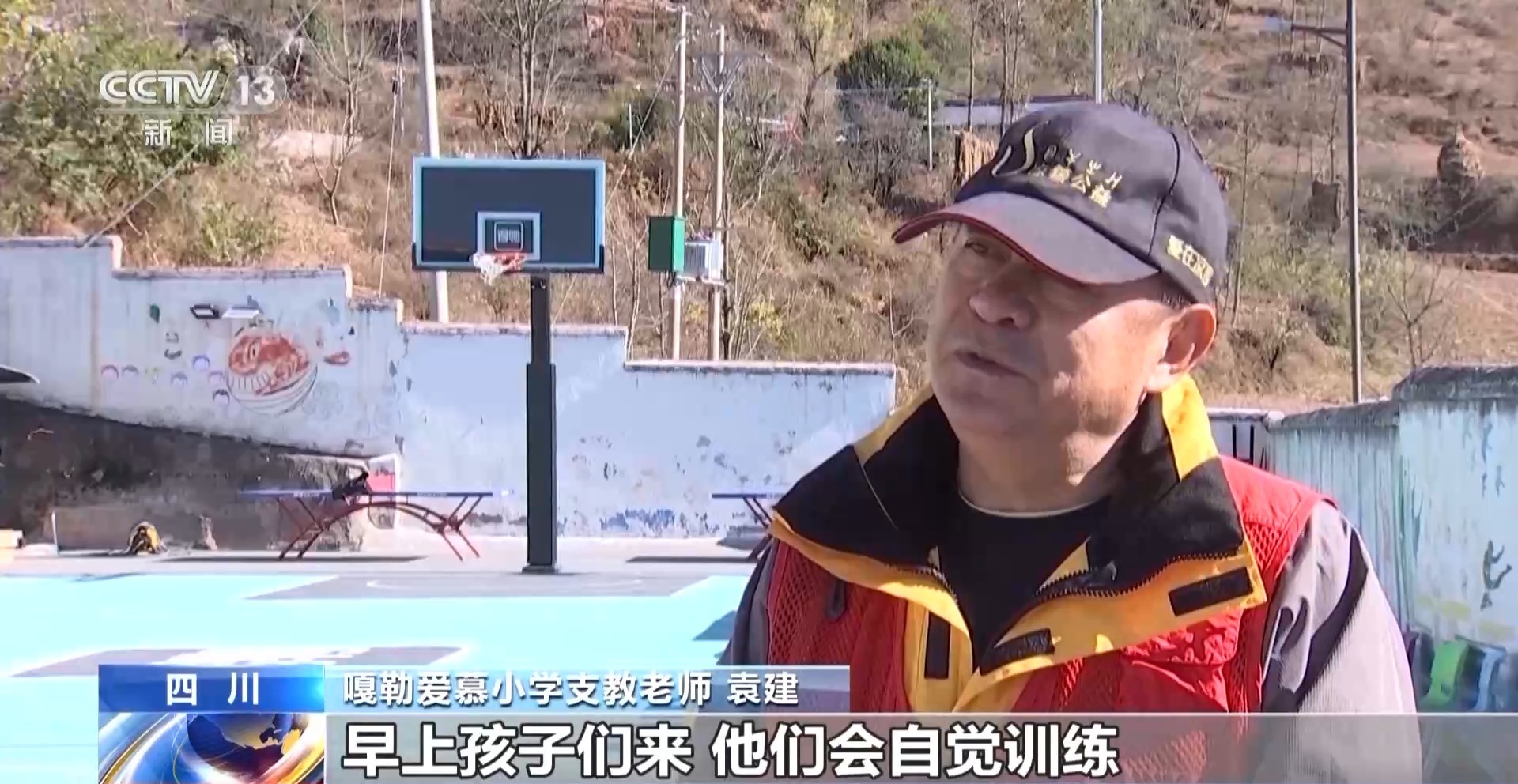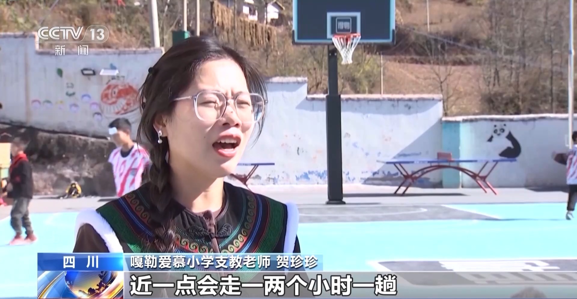 嘎勒爱慕小学支教老师 贺珍珍:近一点会走一两个小时一趟,带孩子去打篮球,远一点会步行四五个小时,来回就是将近十个小时。孩子们每次出发之前会背上背篓,在背篓里放上自己的篮球,放一些食物走到其他学校打篮球。