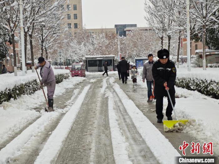 郑州暴雪过后,工作人员清理小区道路积雪。韩章云 摄