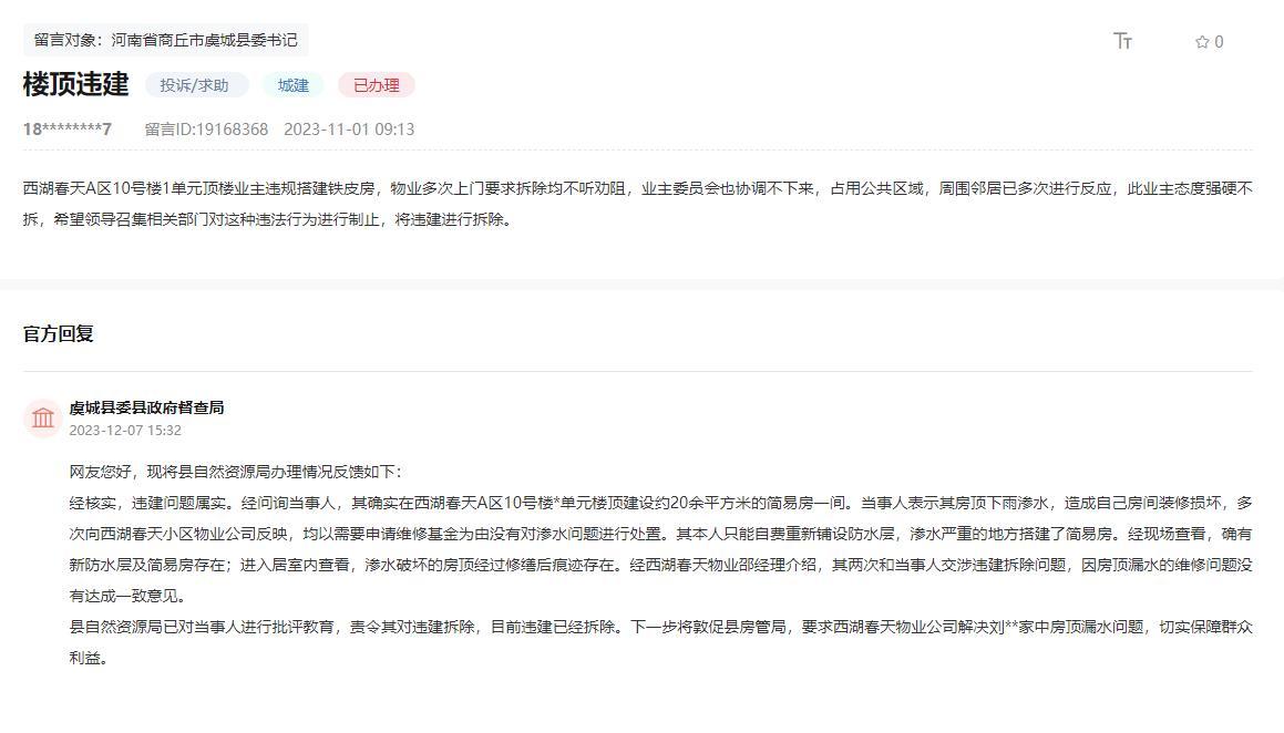 接到网民留言,虞城县自然资源局将办理情况反馈如下:经核实,违建问题属实。经询问当事人,其确实在西湖春天A区10号楼某单元楼顶建设20余平方米的简易房一间。当事人表示其房顶下雨渗水,造成自己房间装修损坏,多次向西湖春天小区物业公司反映,均以需要申请维修基金为由没有对渗水问题进行处置。其本人只能自费重新铺设防水层,渗水严重的地方搭建了简易房。经现场查看,确有新防水层及简易房存在;进入居室内查看,渗水破坏的房顶经过修缮后存在痕迹。经西湖春天物业邵经理介绍,其两次和当事人交涉违建拆除问题,因房顶漏水的维修问题没有达成一致意见。