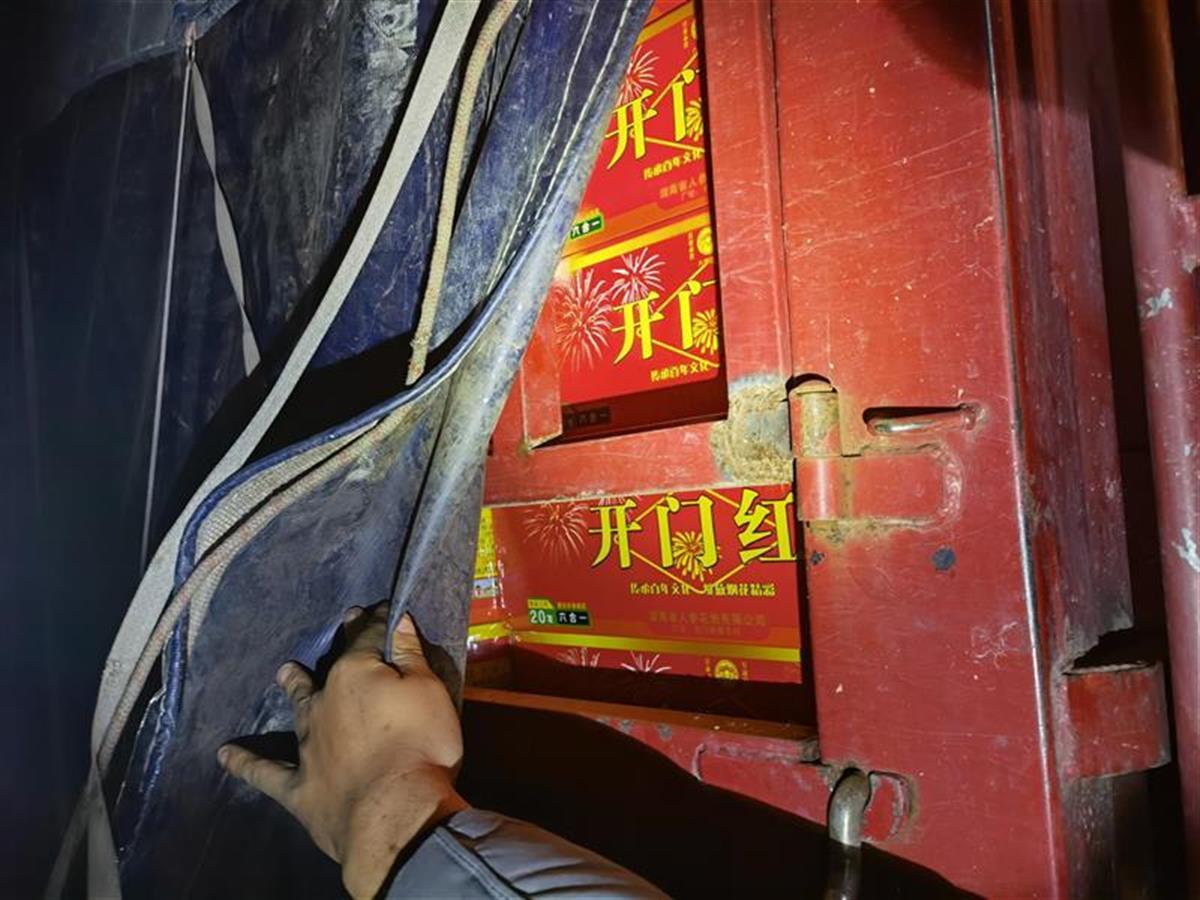 民警发现驾驶员神情很不自然,要求驾驶员打开货厢。厢门打开,民警掀起篷布,发现货厢内堆满了烟花爆竹,大红的纸箱上印着“开门红”“烟花”“20发”“六合一”等字样。