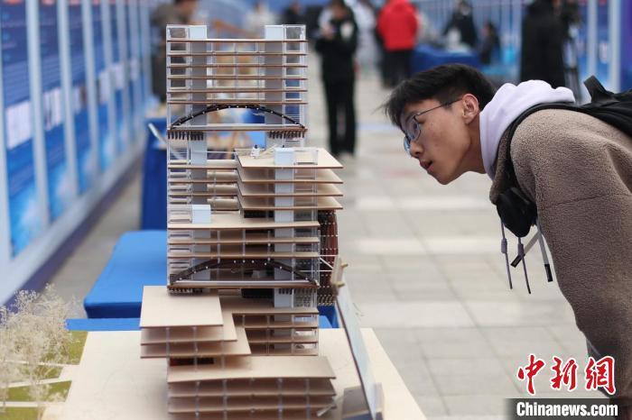 展出的木结构模型“廊桥新生”吸引学生目光。中新网记者 泱波 摄
