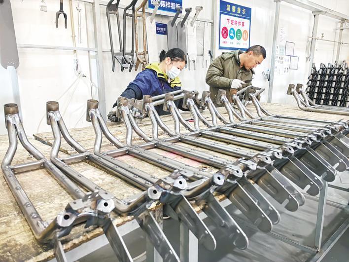 湖北汉米滑板车车架生产线。