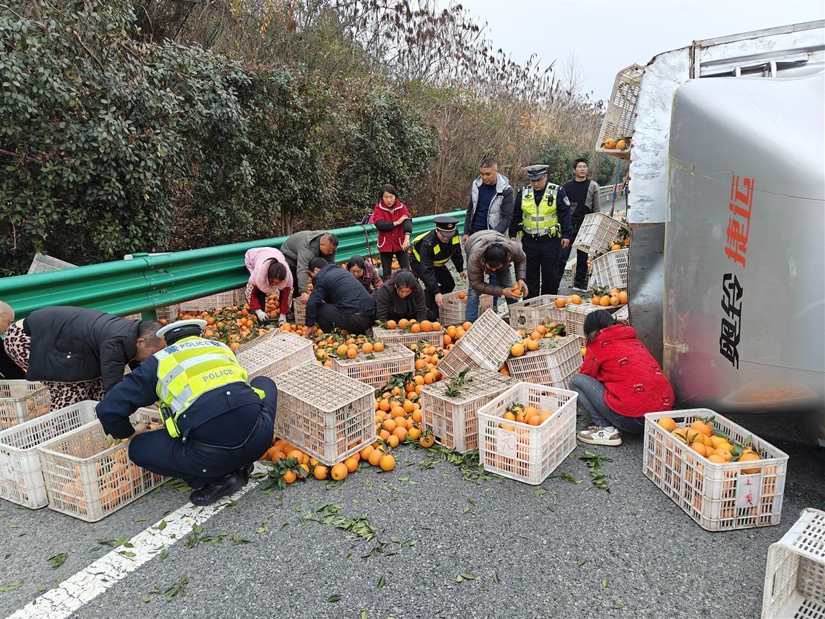 12月12日下午,G42沪蓉高速公路沪蓉向K1113+720m处一运送橙子的厢式货车发生侧翻,满载的橙子撒落高速,导致交通受阻。八支队第六大队联合湖北省高警夷陵大队化身“搬运工”,帮货车司机将撒落的橙子拾起装筐并搬运至转运车。