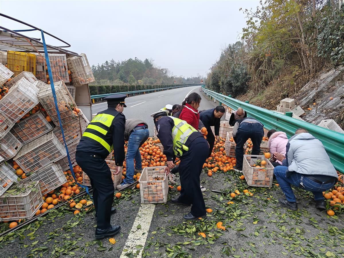 “快快!大家一起把橙子捡拾到水果筐中,抢出一条通道出来。”湖北省交通运输综合行政执法局八支队第六大队路政班长吴明亮吆喝道。