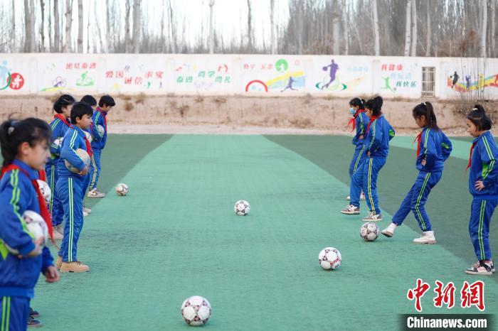 12月13日,新疆阿图什依克萨克小学,女生们正在练习足球。中新社记者 韩海丹 摄