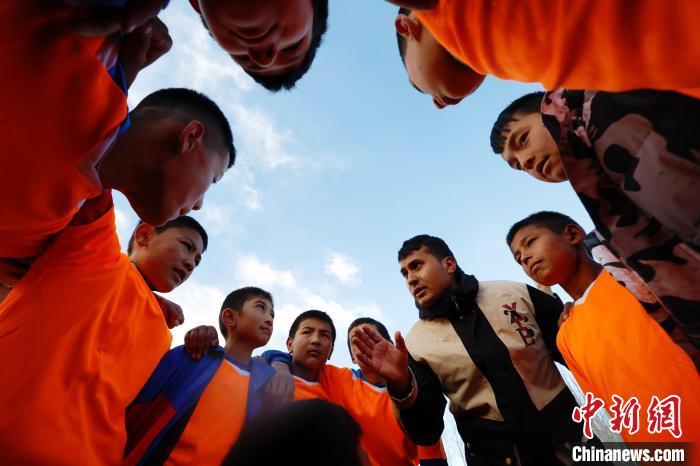 12月13日,新疆阿图什一场乡村小学间的足球赛正在激烈进行。图为教练为孩子们指导战术。中新社记者 韩海丹 摄