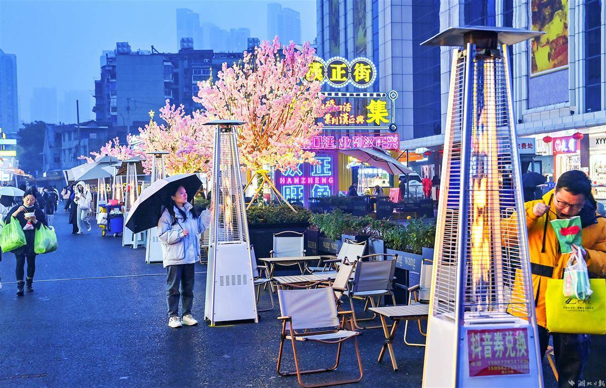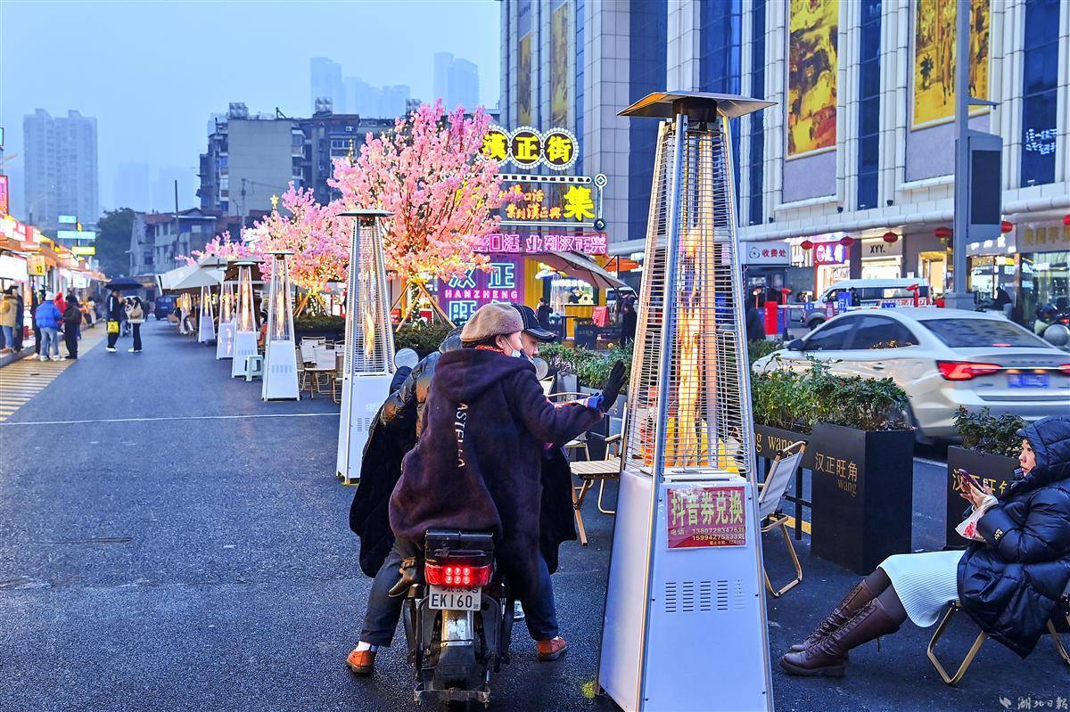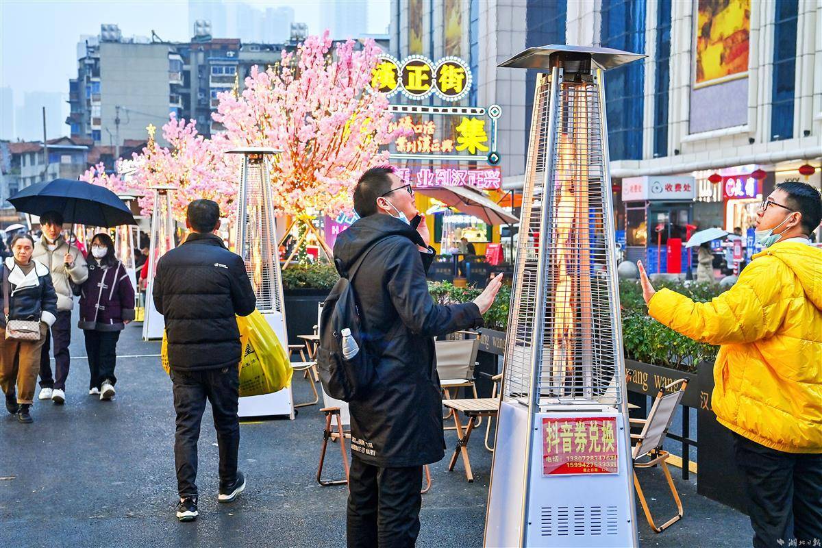 12月13日傍晚,空中飘着细雨,许多市民游客来到武汉汉正街旺角小吃街打卡,一边享受着美食,一边随时烤火取暖。