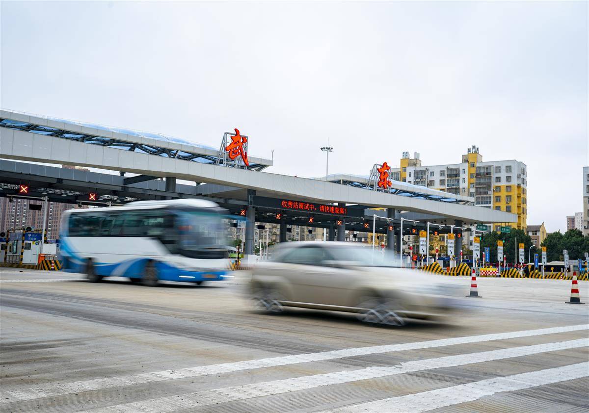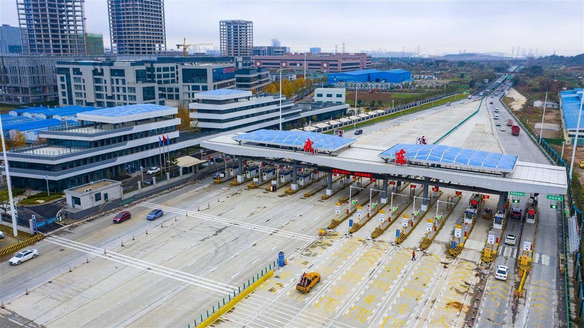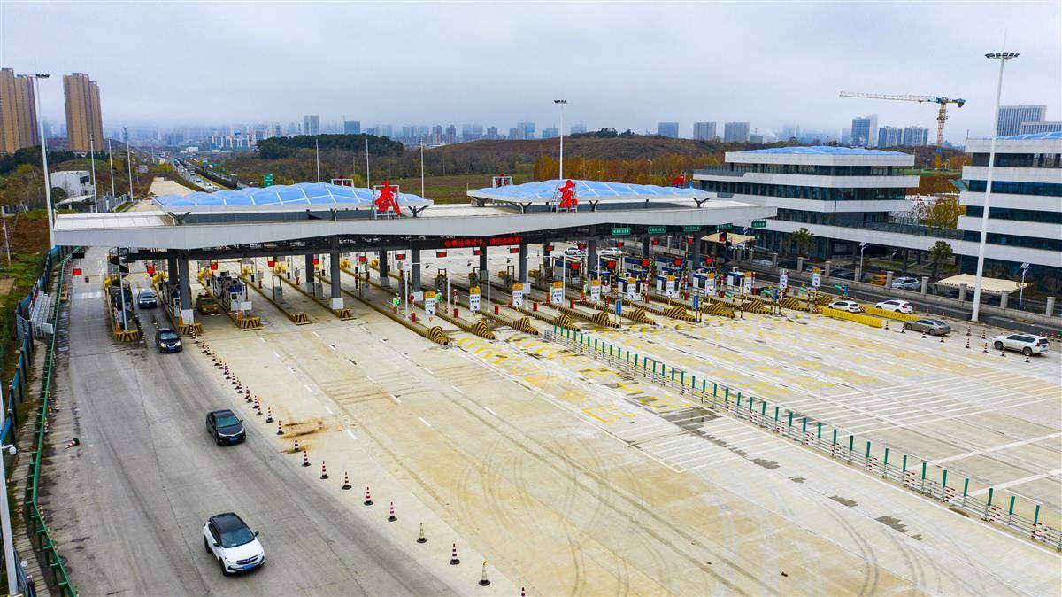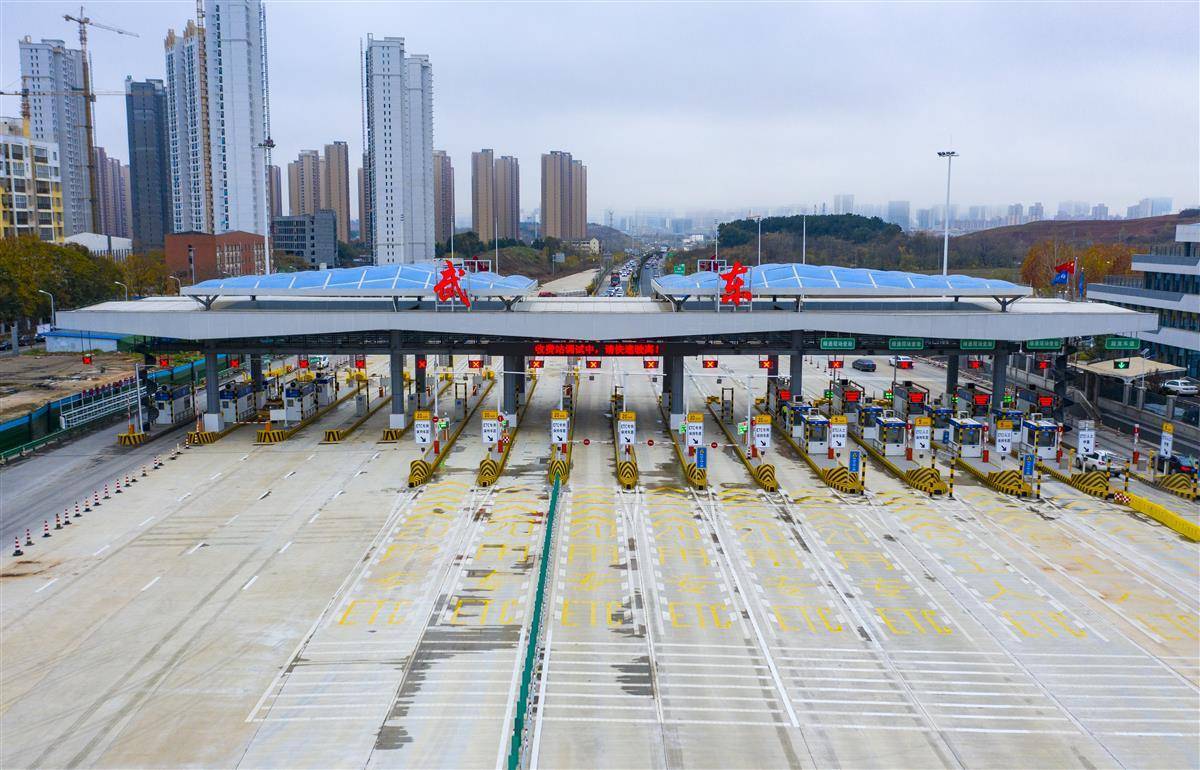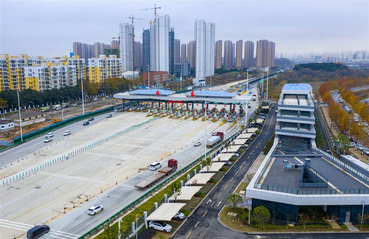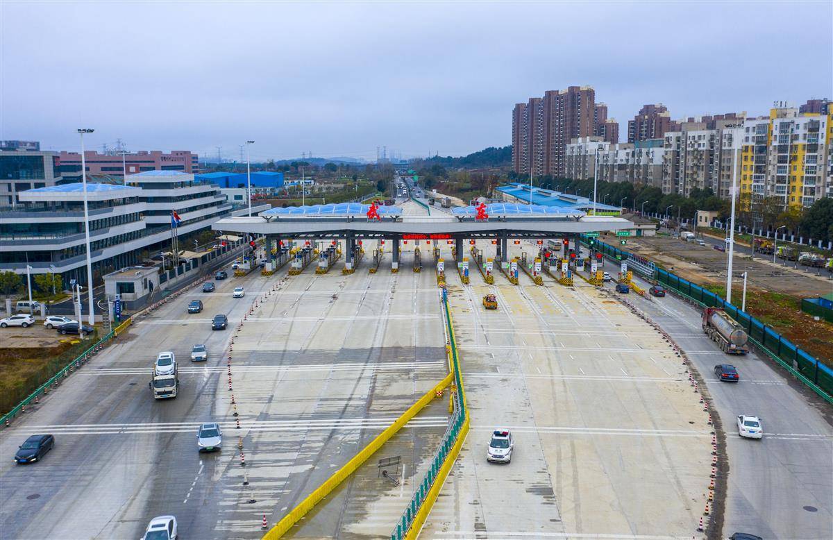 12月14日,航拍位于光谷的武黄高速新武东收费站。自12月15日0时起,武黄高速新武东收费站将开通投用。原武东收费站和豹澥收费站将于12月14日24时停止收费、并于近期陆续撤除。这标志着“武鄂黄黄”一体化发展更进一步,对于加快实施高新三路改造提升,加快完善武汉新城与鄂黄黄快速道路布局,实现大光谷南北联动、产城融合,推动相关国家级产业基地的联动发展,建设武汉新城、真正实现武鄂黄黄同城化具有重要意义。新站“8进9出”,共17个车道,比原站“6进9出”多出2个车道。新站还新增百余米长的可移动隔离带,可根据节假日、高峰期车辆骤增时,适时调整车行道数量,构建“潮汐车道”,缓解出城或进城的拥堵压力。(湖北日报全媒记者 魏铼 通讯员 李峰 栾冰 方勇 摄)