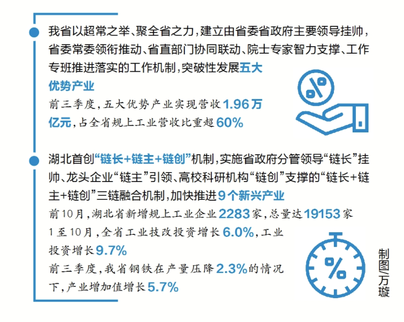 聚焦9个新兴特色产业,湖北首创“链长+链主+链创”机制,实施省政府分管领导“链长”挂帅、龙头企业“链主”引领、高校科研机构“链创”支撑的“链长+链主+链创”三链融合机制,出台三年行动计划和重点任务清单,制定冶金、化工等产业转型发展方案,努力拓展新领域、开辟新赛道。截至12月14日,省政府新闻办已举行“推进‘链长+链主+链创’机制 加快新型工业化发展”系列新闻发布会八场,助力产业发展。