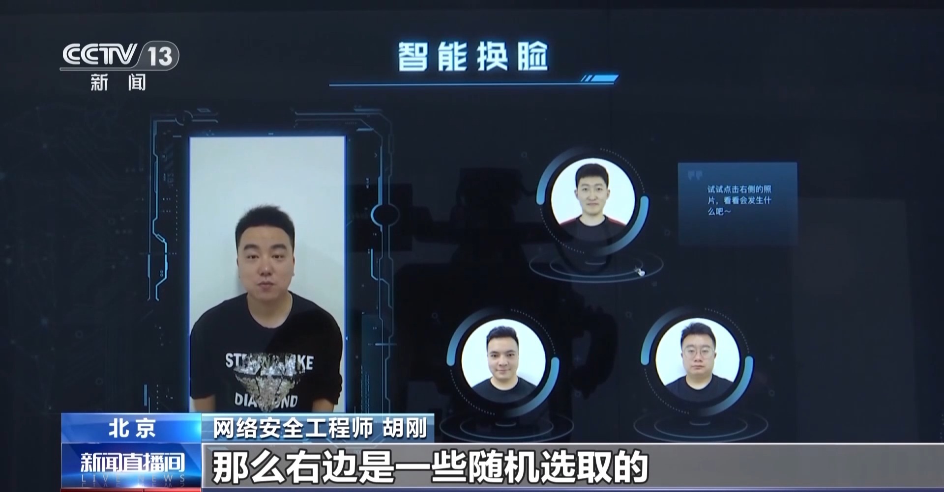 网络安全工程师 胡刚:这个是我们的一个智能换脸演示系统,左边是我们预制好的一个视频,右边是一些随机选取的第三方人物的形象,它是一个静态的正面照片。我们通过这种AI补齐的技术,将原本只有正面的照片补齐到了视频当中,原本静态的人物被立体化了。