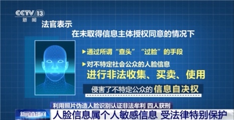 根据我国民法典、个人信息保护法等相关法律的规定,人脸信息是属于人的生物识别信息,人脸识别信息与其他的个人信息相比具有不可更改的性质,所以是作为个人敏感信息予以特别保护。法官表示,在未取得信息主体授权同意的情况下,通过所谓“查头”“过脸”的手段对不特定社会公众的人脸信息进行非法收集、买卖、使用,侵害了不特定公众的信息自决权。