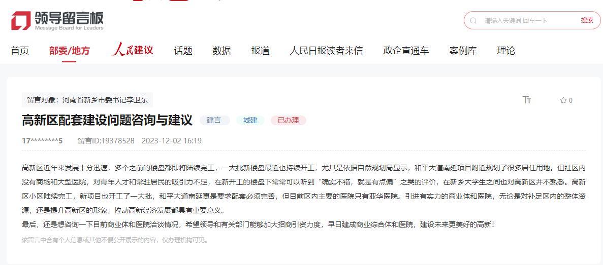 人民网郑州12月15日电(于思远)“高新区近年来发展十分迅速,但社区内没有商场和大型医院,对青年人才和常驻居民的吸引力不足。”近日,来自河南省新乡市的网民张先生在人民网“领导留言板”上建议新乡市高新区引进有实力的商业体和医院。