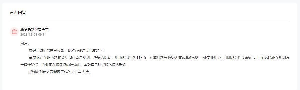 接到留言后,新乡市高新区对该条留言进行了及时回复,回复中称,新乡市高新区在午阳西路和关堤街东南角规划了一所综合医院,用地面积约为115亩;在海河路与牧野大道东北角规划一处商业用地,用地面积约为65亩。