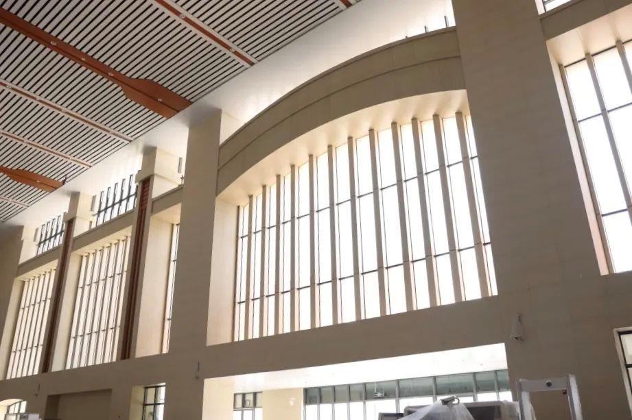 站房装修融入地方特色元素,墙柱模拟当地少数民族京族特有乐器“独弦琴”形态,并借鉴当地建筑弧形门洞造型,整体采用米黄色,增加当地木色元素进行点缀。