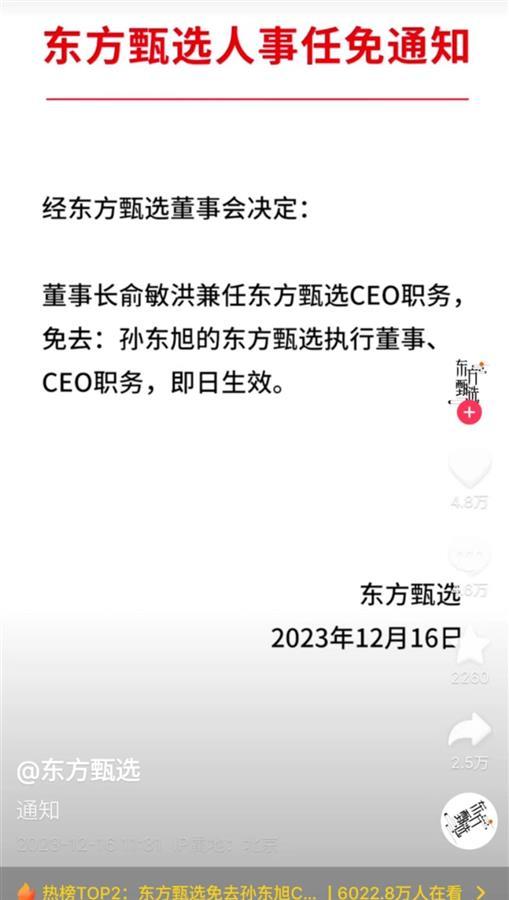 12月16日,东方甄选发布人事任免通知,经东方甄选董事会决定:董事长俞敏洪兼任东方甄选CEO职务,免去孙东旭的东方甄选执行董事、CEO职务,即日生效。